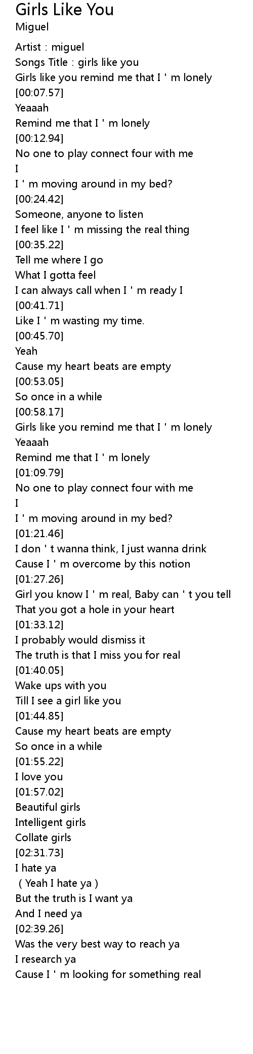 | [00:02.43] | Girls like you remind me that I m lonely |