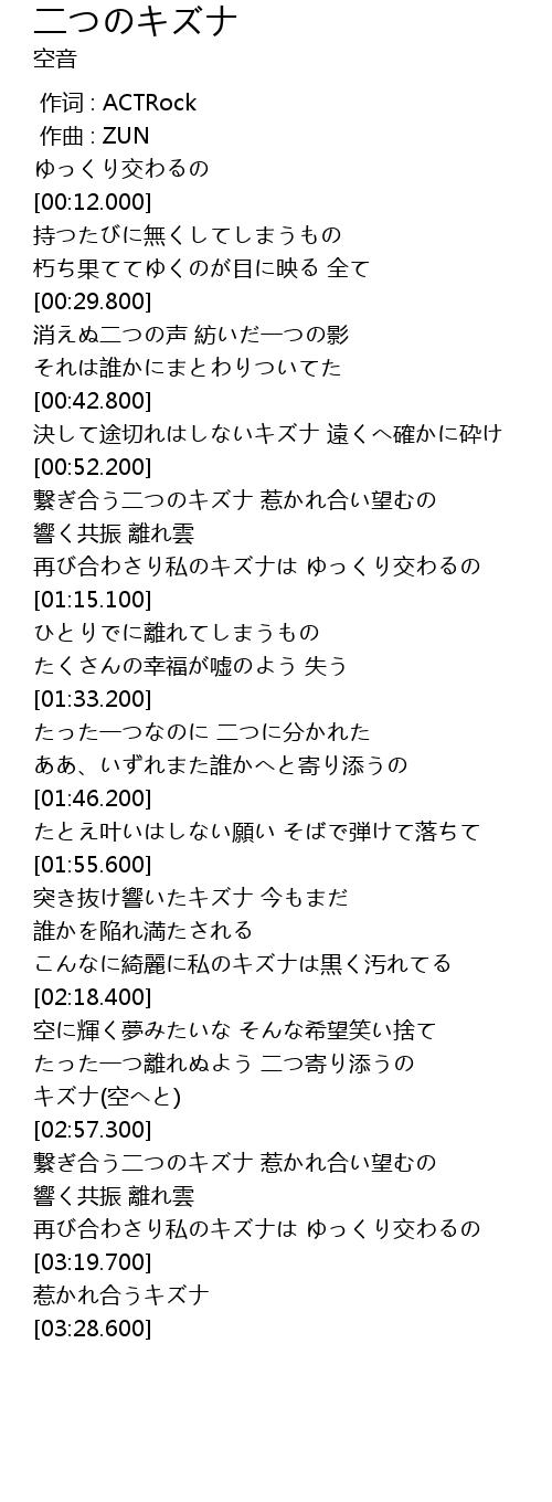 | [02:44.700] | たった一つ離れぬよう 二つ寄り添うの キズナ(空へと) |