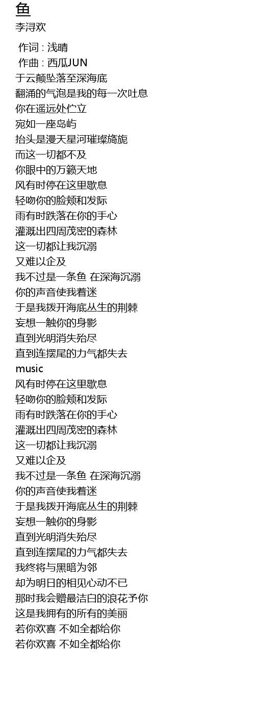 | [02:36.075] | 我不过是一条鱼 在深海沉溺 |