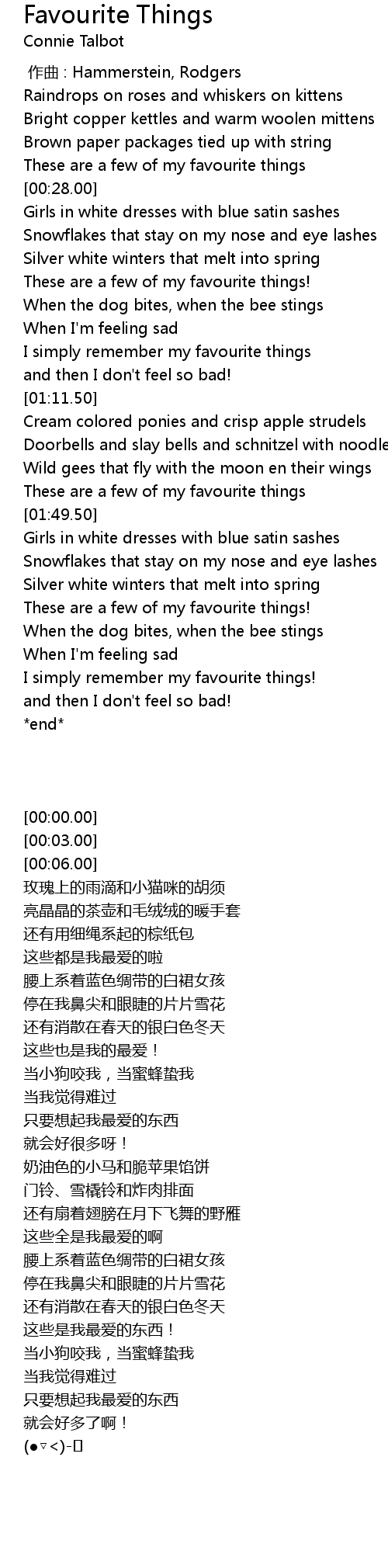 | [00:09.58] | Raindrops on roses and whiskers on kittens |