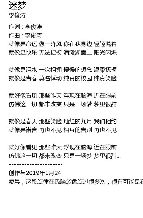 | chuàng zuò yǔ 2019 nián 1 yuè 24 líng chén, zhè duàn xuán lǜ zài wǒ nǎo dài pán xuán guò hěn duō cì, hěn yǒu kě néng shì zài mǒu gè chǎng jǐng gǎn shòu guò lèi sì zhè yàng hěn méng lóng de gǎn jué, tā xiàng shì zài shí guāng lǐ, měi yī zhǒng céng jīng shí guāng lǐ de yìn jì dōu biàn de xiān míng, càn làn de yáng guāng, qīng xīn de kōng qì, yíng miàn zǒu lái de chún zhēn xiào liǎn, tā men qīng xī yòu méng lóng, zhè zhǒng shí guāng lǐ de gǎn jué, hěn měi... |