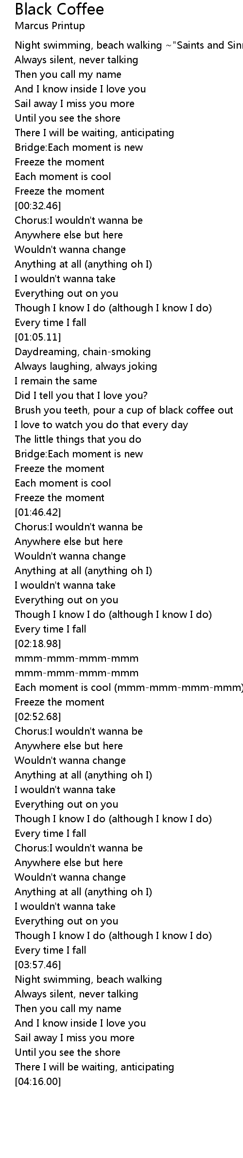[00:00.54] Night swimming, beach walking ~"Saints and Sinners" - "Black Coffee"~
