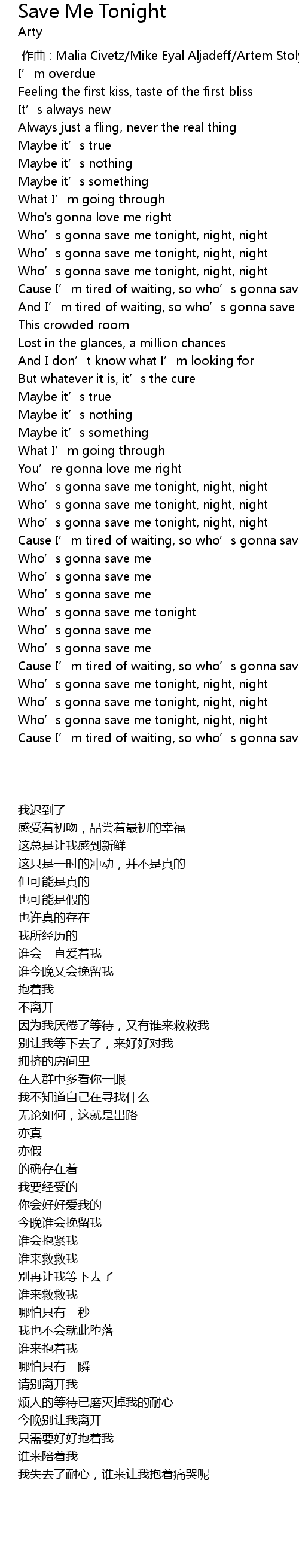 | [00:49.89] | Cause I' m tired of waiting, so who' s gonna save me tonight |