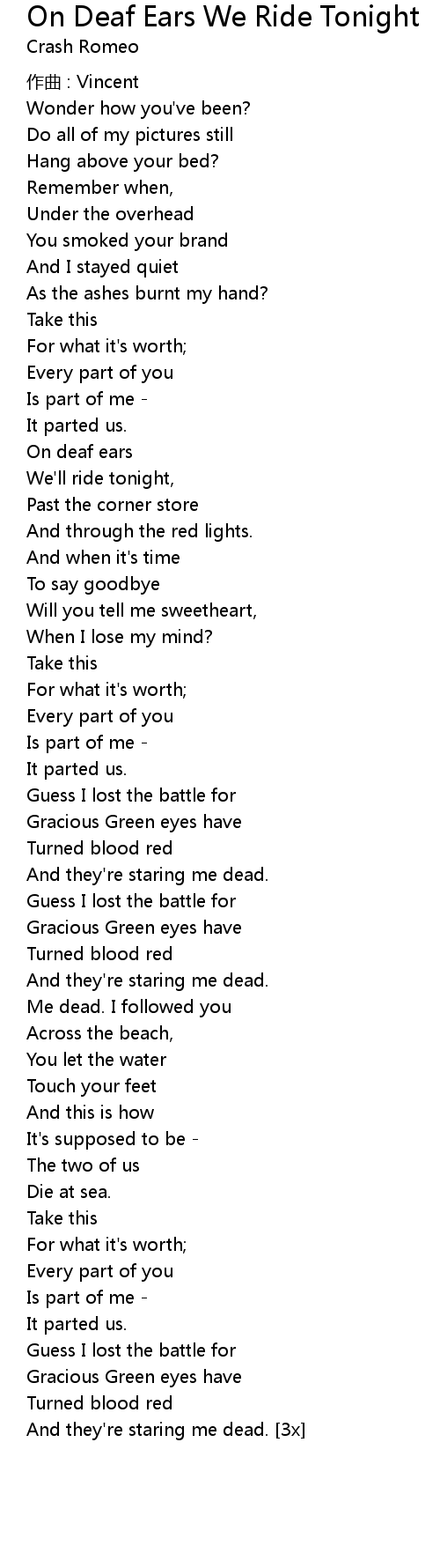 | 歌曲 | On Deaf Ears We Ride Tonight |