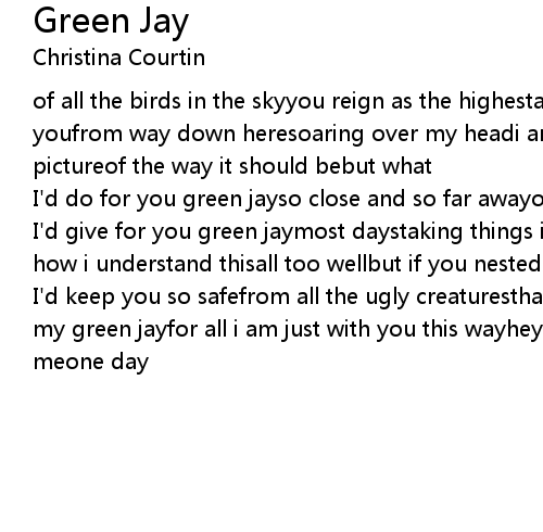 I'd keep you so safefrom all the ugly creaturesthat want to eat yabut i do too my green jayfor all i am just with you this wayhey something good will come for meone day |