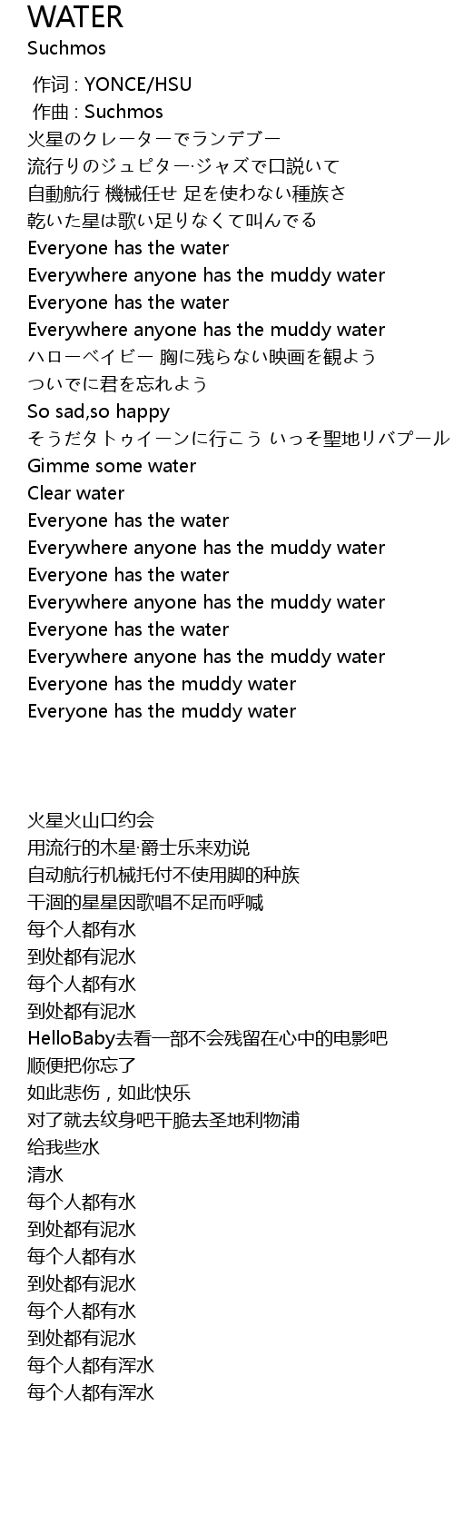 | [02:57.00] | Everywhere anyone has the muddy water |