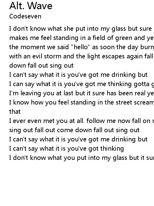I don't know what she put into my glass but sure makes me feel yeah it sure makes me feel standing in a field of green and yellow spinning like a wheel from the moment we said "hello" as soon the day burns away and the dead hours form with an evil storm and the light escapes again fall down sing out fall out come down fall out sing out |