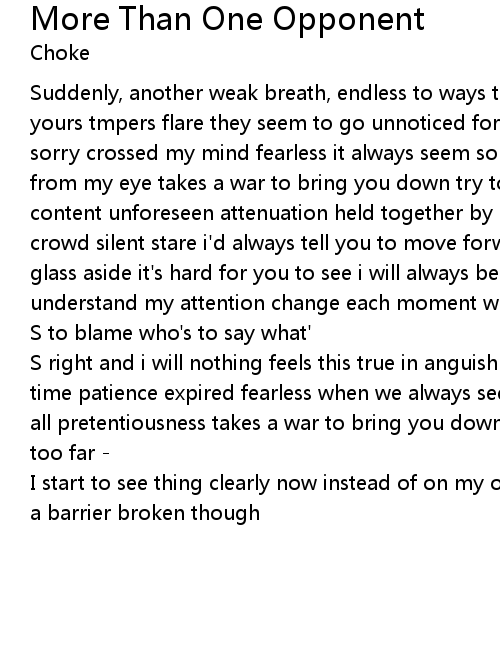 | Suddenly, another weak breath, endless to ways to reenact the conflict within yours tmpers flare they seem to go unnoticed for the last time hold on tight sorry crossed my mind fearless it always seem so selfish faint refleciotn fallen from my eye takes a war to bring you down try to search for resistance fragile content unforeseen attenuation held together by my voice tearing through the crowd silent stare i'd always tell you to move forward confident to push broken glass aside it's hard for you to see i will always be close by hear me breating understand my attention change each moment who' | |
