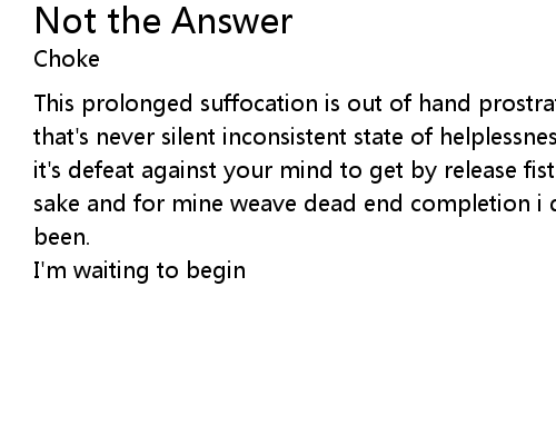 | This prolonged suffocation is out of hand prostrate to pressure rise a silence that's never silent inconsistent state of helplessness the end is not the answer it's defeat against your mind to get by release fists of untied anxiety for your sake and for mine weave dead end completion i don't want to feel the way i've been. | |