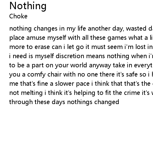 nothing changes in my life another day, wasted day now can i get far from this place amuse myself with all these games what a lie what a shame now there is no more to erase can i let go it must seem i'm lost in despair no one beside me all i need is myself discretion means nothing when i'm happy this way i don't want to be a part on your world anyway take in everything, a simple view it explains you a comfy chair with no one there it's safe so i have myself a simple mind to me that's fine a slower pace i think that that's the case it's nothing my mind's not melting i think it's helping to fit the crime it's what i need to get me through these days nothings changed |