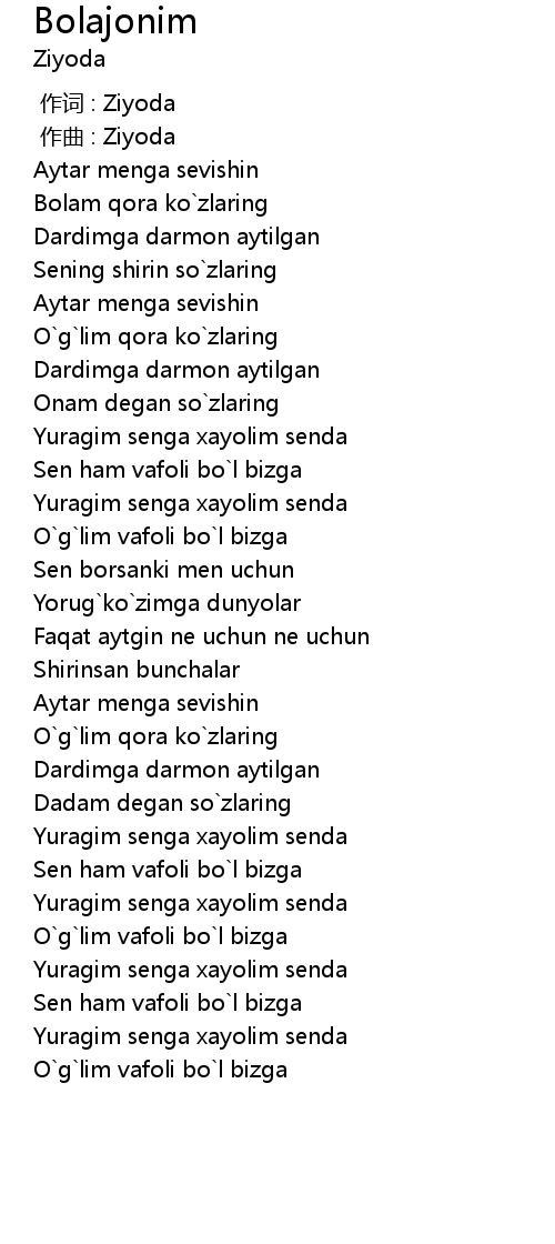 | [00:39.368] | O`g`lim qora ko`zlaring |