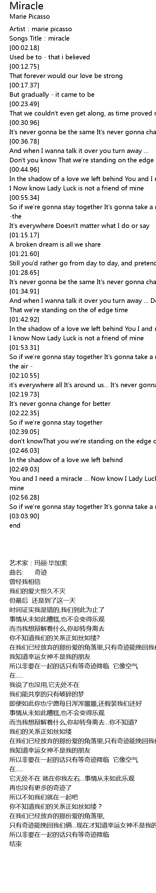 | [02:50.72] | You and I need a miracle ... Now know I Lady Luck friend is not of a mine |