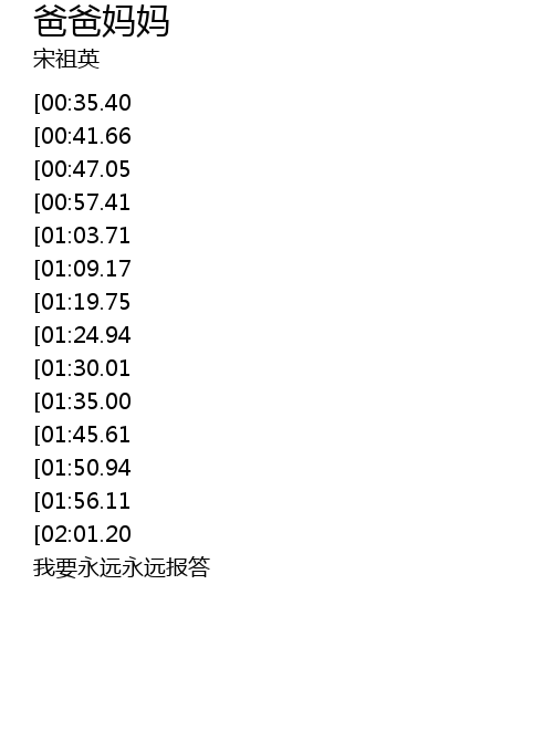 | [02:22.68][00:35.40] | 轻轻的叫一声 爸爸妈妈 |