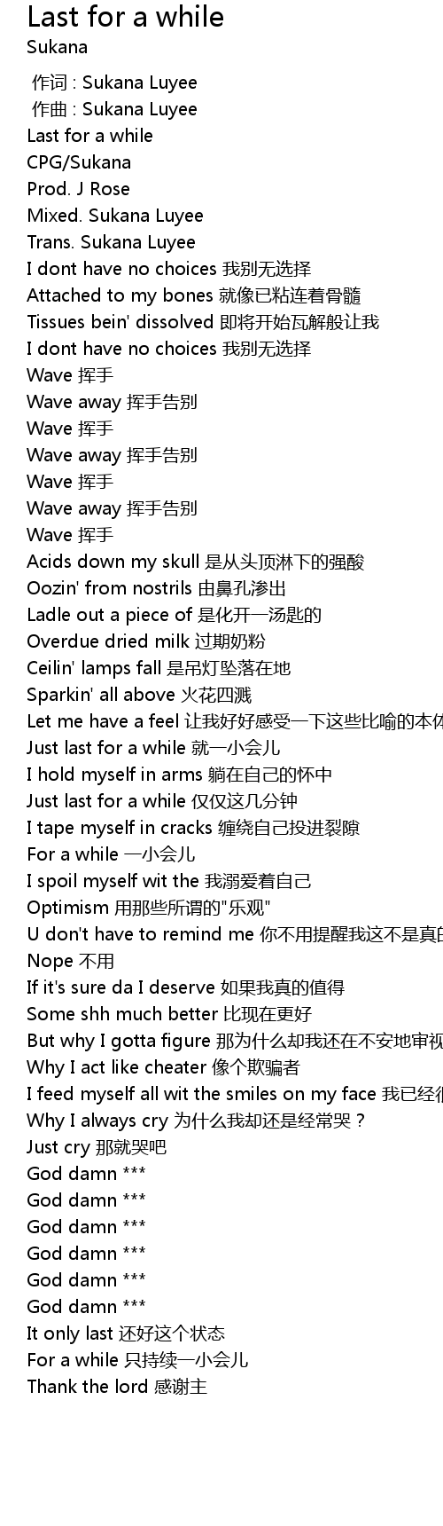 | [02:22.951] | For a while zhǐ chí xù yī xiǎo huì ér |