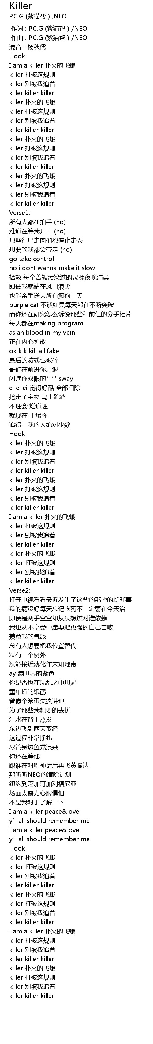 | [02:30.176] | killer 打破这规则 |