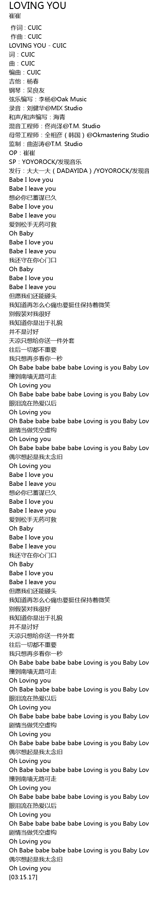 | [02:14.61] | Oh Babe babe babe babe Loving is you Baby Loving you |