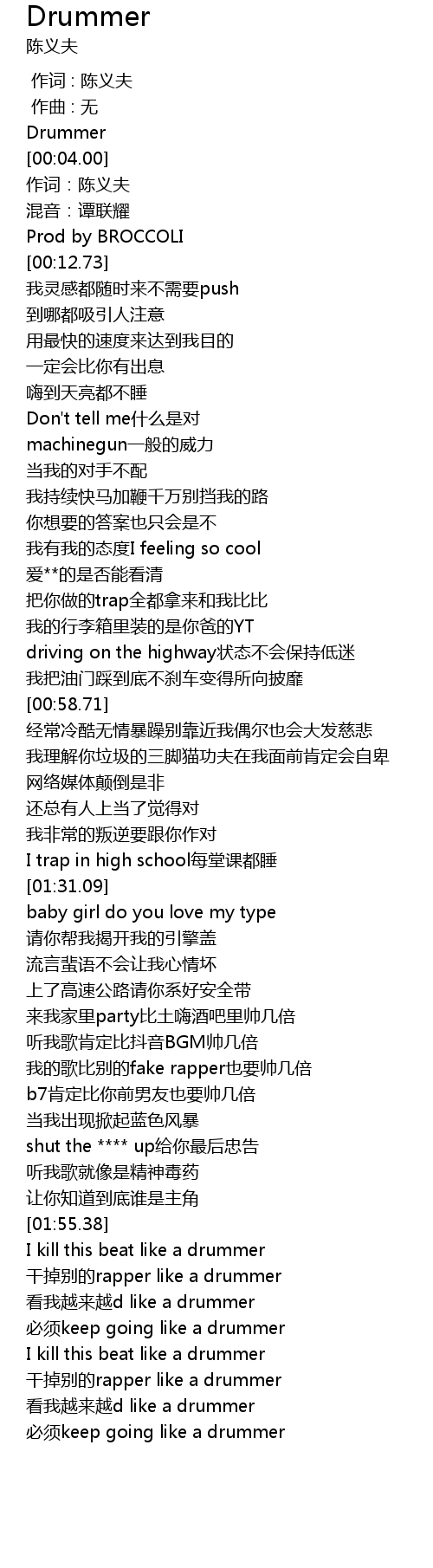 | [02:04.17] | I kill this beat like a drummer |