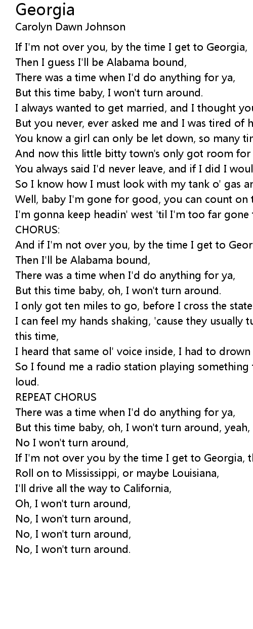 If I'm not over you by the time I get to Georgia, then I'll head to Alabama, |