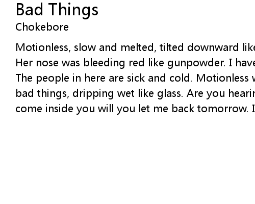 | Motionless, slow and melted, tilted downward like a dying bird. Is anybody here? Her nose was bleeding red like gunpowder. I have seen the wind blow through her. The people in here are sick and cold. Motionless wearing strange wings, doing bad things, dripping wet like glass. Are you hearing this? But if I wait and come inside you will you let me back tomorrow. Is anybody home at all? |