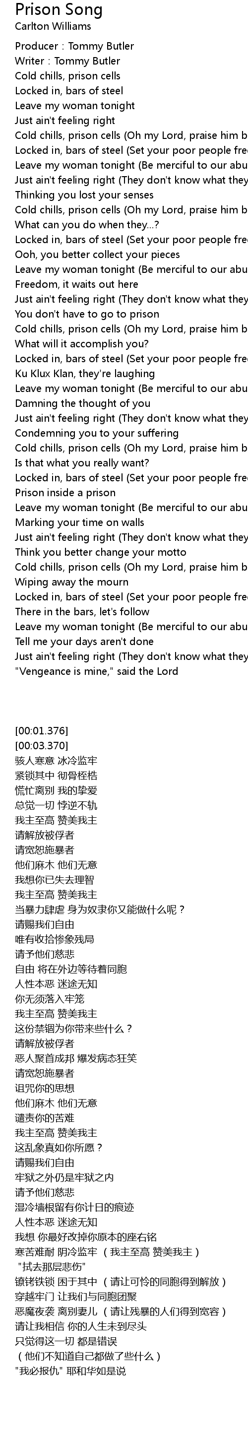 | [00:55.096] | Cold chills, prison cells Oh my Lord, praise him be |
