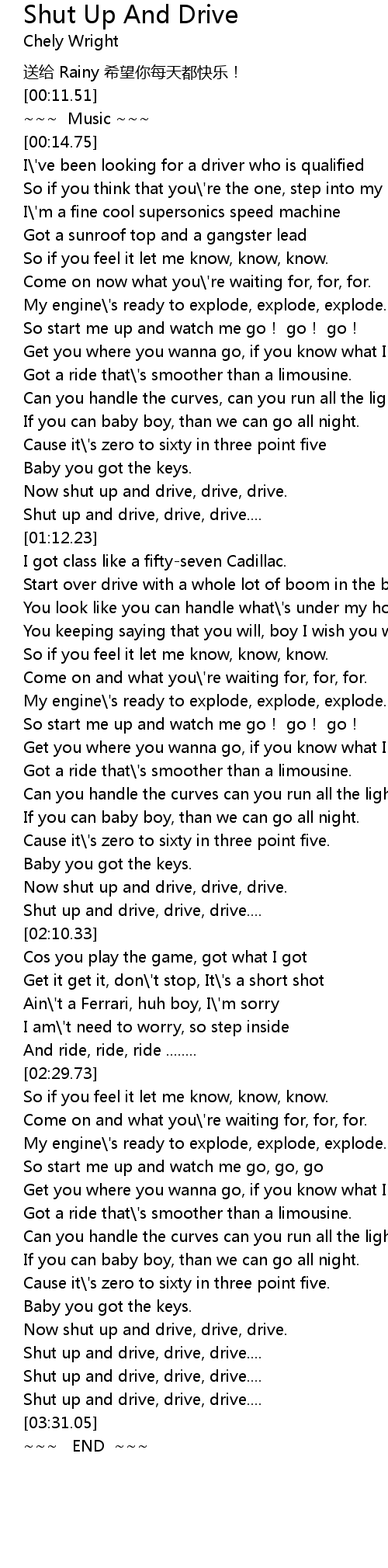 | [03:11.72] | Shut up and drive, drive, drive.... |