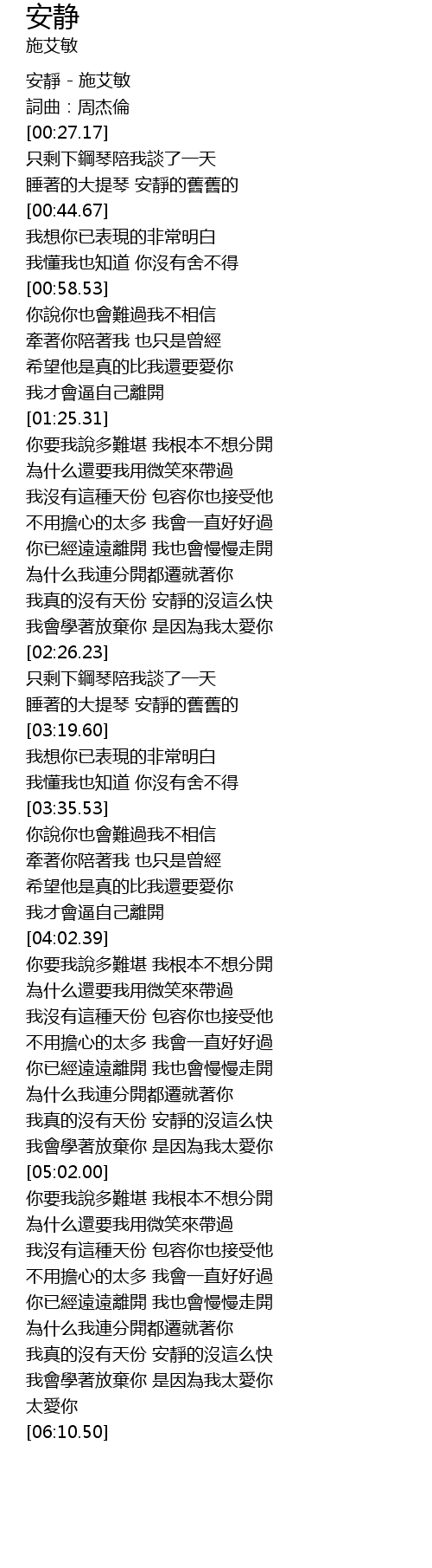 | [04:46.96] | wǒ zhēn de méi yǒu tiān fèn ān jìng de méi zhè me kuài |