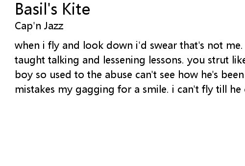 | when i fly and look down i'd swear that's not me. that's not me. forget your taught talking and lessening lessons. you strut like a stutter. dumb loser user boy so used to the abuse can't see how he's been used. pokes me in the side. mistakes my gagging for a smile. i can't fly till he can fly. |