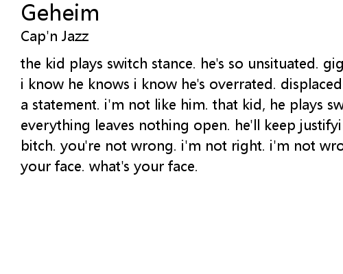| the kid plays switch stance. he's so unsituated. giggling girls. his hair curls. i know he knows i know he's overrated. displaced in his placement. tripped up in a statement. i'm not like him. that kid, he plays switch stance. opening everything leaves nothing open. he'll keep justifying. he knows i'll continue to bitch. you're not wrong. i'm not right. i'm not wrong. you're not right. show me your face. what's your face. |