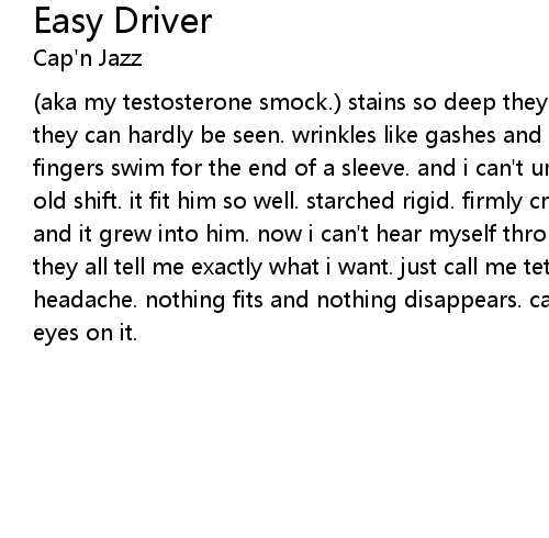 (aka my testosterone smock.) stains so deep they can see no end. stains so many they can hardly be seen. wrinkles like gashes and dirt formed shadows. my fingers swim for the end of a sleeve. and i can't understand. it's just my dad's old shift. it fit him so well. starched rigid. firmly creased. he grew into it and it grew into him. now i can't hear myself through all the sounds in my head. they all tell me exactly what i want. just call me tetris. i've got the headache. nothing fits and nothing disappears. call me tetris. i can't close my eyes on it.