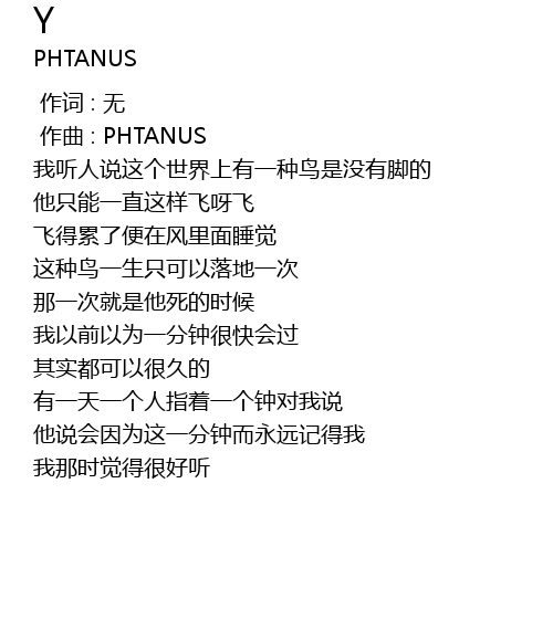 | [00:06.734] | wǒ tīng rén shuō zhè gè shì jiè shang yǒu yī zhǒng niǎo shì méi yǒu jiǎo de |