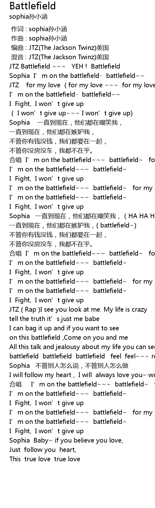 | [00:13.95] | Sophia I' m on the battlefield battlefield |