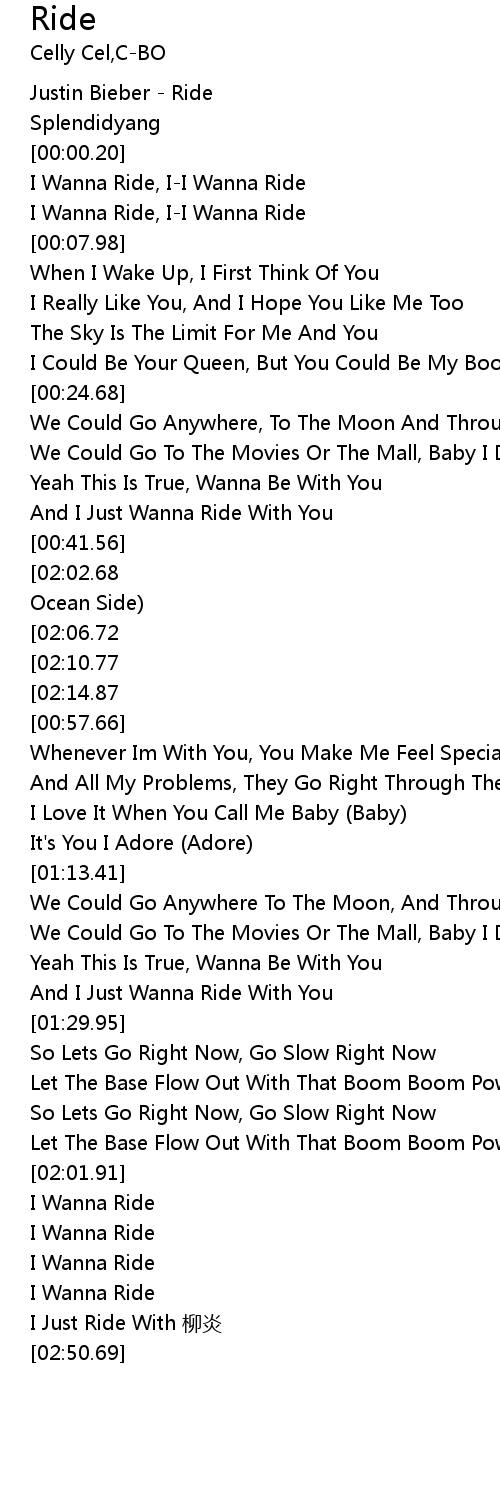 | [02:31.06][02:14.87][01:42.26][00:53.49] | I Wanna Ride, I-I Wanna Ride With You |