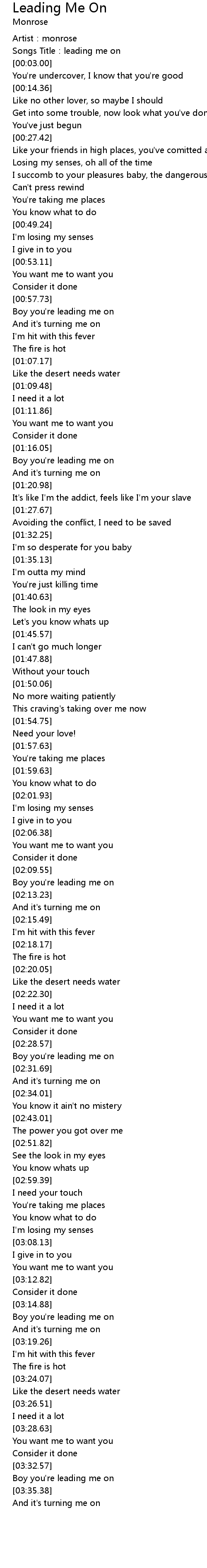 | [03:16.32] | Boy you' re leading me on |