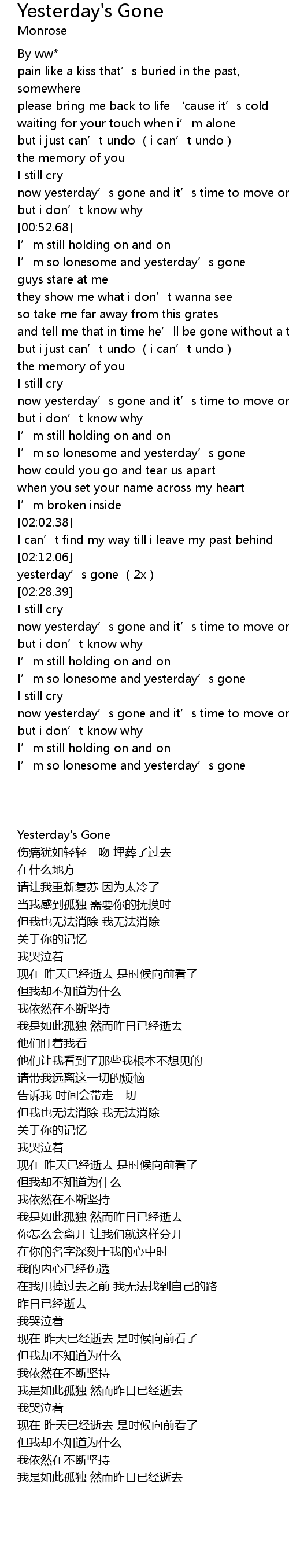 | [00:56.48] | I' m so lonesome and yesterday' s gone |