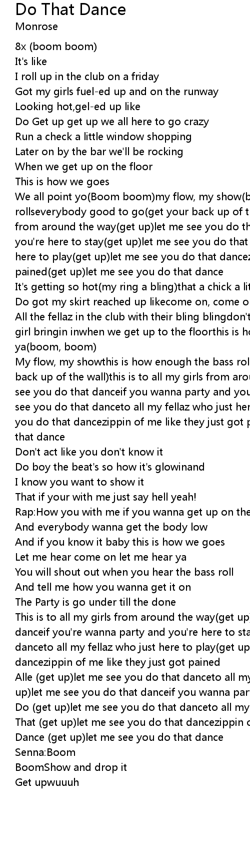 We all point yo(Boom boom)my flow, my show(boom boom)this is how enough the bass rollseverybody good to go(get your back up of the wall)this is to all my girls from around the way(get up)let me see you do that danceif you wanna party and you're here to stay(get up)let me see you do that danceto all my fellaz who just here to play(get up)let me see you do that dancezippin of me like they just got pained(get up)let me see you do that dance |