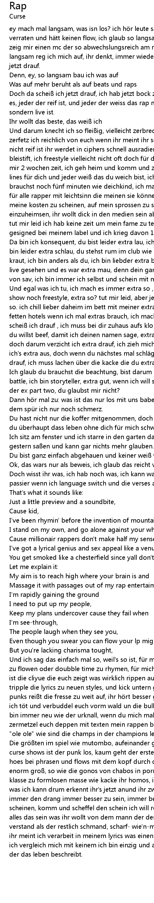 | Ich glaub du brauchst die beachtung, bist darum extra dauf, doch schei auf battle, ich bin storyteller, extra gut, wenn ich will schreib auf kommando con der ex part two, du glaubst mir nicht? | |
