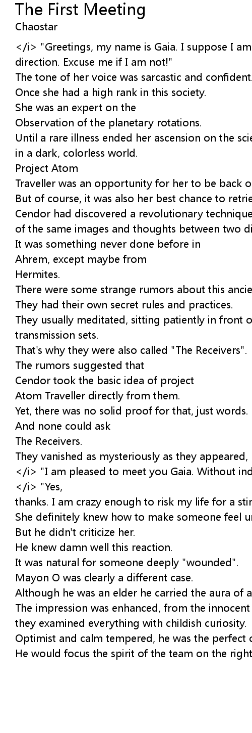 | They vanished as mysteriously as they appeared, leaving no trace behind them. [Cendor:]</i> "I am pleased to meet you Gaia. Without individuals like you science would never transcend from theory to practice." [Gaia:]</i> "Yes, thanks. I am crazy enough to risk my life for a stinking experiment!" | |