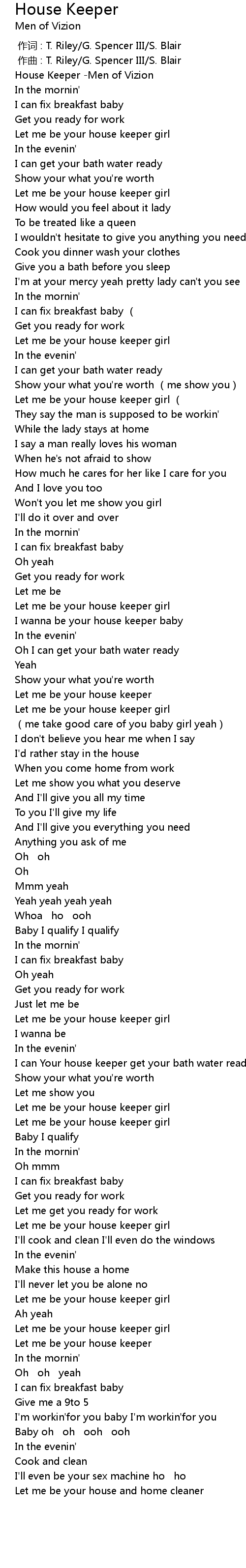 | [00:00.00] | House Keeper Men of Vizion |
