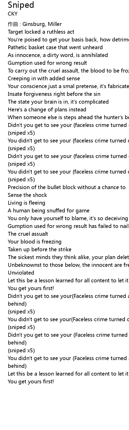 | Didn't you get to see your(Faceless crime turned against you? sniped from behind) | |