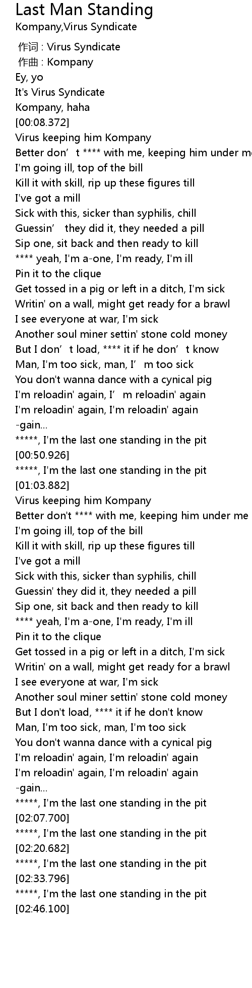 | [02:30.975] | *****, I'm the last one standing in the pit |