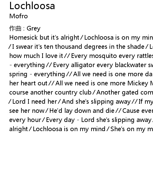 | Homesick but it's alright ⁄ Lochloosa is on my mind ⁄ She's on my mind ⁄ ⁄ I swear it's ten thousand degrees in the shade ⁄ Lord have mercy knows - how much I love it ⁄ ⁄ Every mosquito every rattlesnake ⁄ Every cane break - everything ⁄ ⁄ Every alligator every blackwater swamp ⁄ Every freshwater spring - everything ⁄ ⁄ All we need is one more damn developer ⁄ Tearing her heart out ⁄ ⁄ All we need is one more Mickey Mouse ⁄ Another golf course another country club ⁄ Another gated community ⁄ ⁄ Lord I need her ⁄ Lord I need her ⁄ And she's slipping away ⁄ ⁄ If my grandfather could see her now ⁄ He'd lay down and die ⁄ ⁄ Cause every minute every second every hour ⁄ Every day - Lord she's slipping away ⁄ ⁄ Homesick but it's alright ⁄ Lochloosa is on my mind ⁄ She's on my mind |