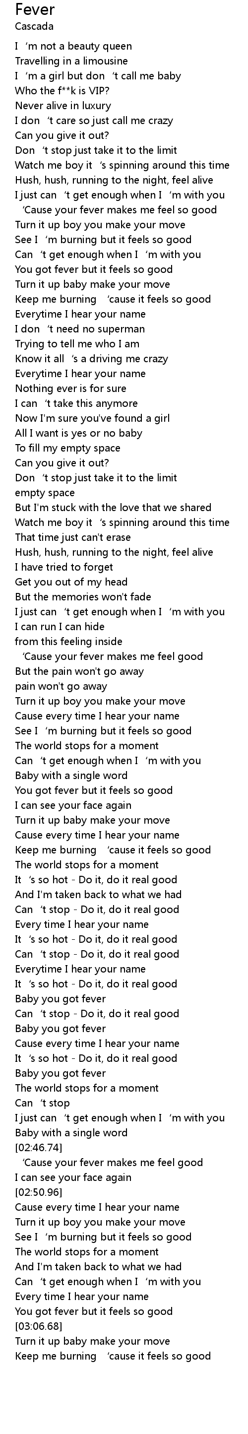 | [02:50.52] | ' Cause your fever makes me feel good |