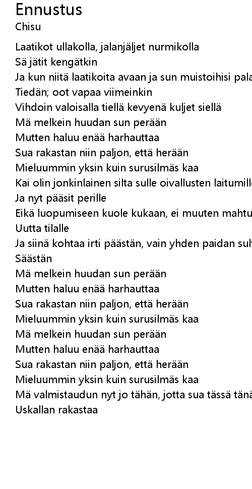 | Ja kun niit laatikoita avaan ja sun muistoihisi palaan | |