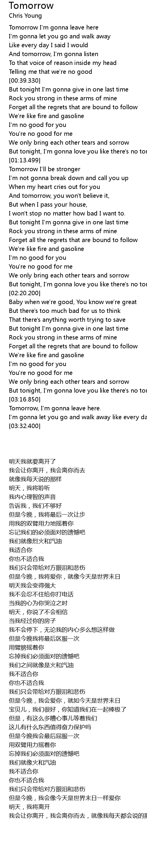 | [00:13.570] | Tomorrow I'm gonna leave here |