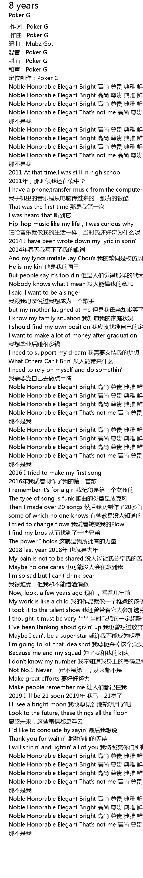 | [01:37.72] | Noble Honorable Elegant Bright 高尚 尊贵 典雅 鲜亮 |