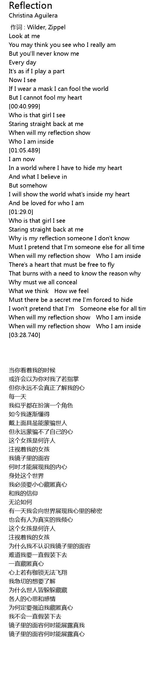 | [02:58.829] | When will my reflection show Who I am inside |