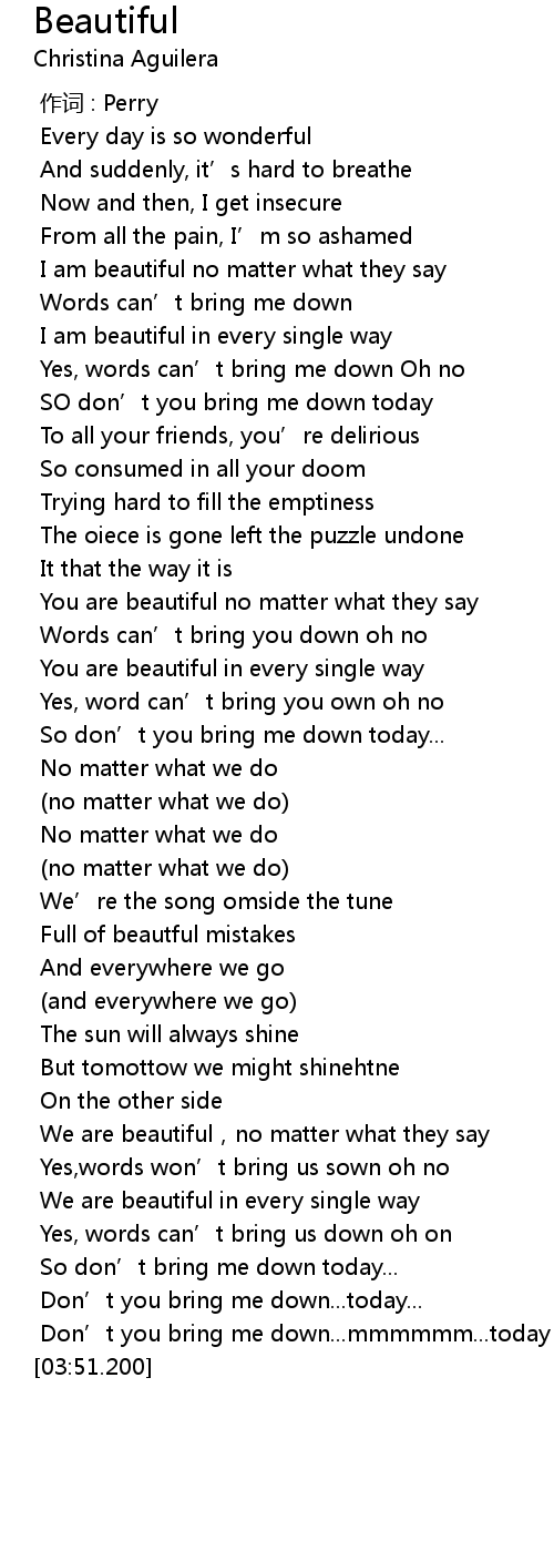 | [01:09.650] | Yes, words can' t bring me down Oh no |