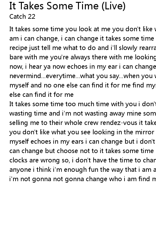 | It takes some time too much time with you i don't know what to do taking time is wasting time and i'm not wasting away mine someone is telling me, yelling and selling me to their whole crew rendez-vous it takes some time so don't bother me you don't like what you see looking in the mirror it's much clearer now i hear myself echoes in my ears i can change but i don't want to fine the way i am i can change but choose not to it takes some time but watch is gone and all my clocks are wrong so, i don't have the time to change i can't change for you or anyone i think i'm enough fun the way that i am and i'm finding new friends and i'm not gonna not gonna change who i am find myself inside... |