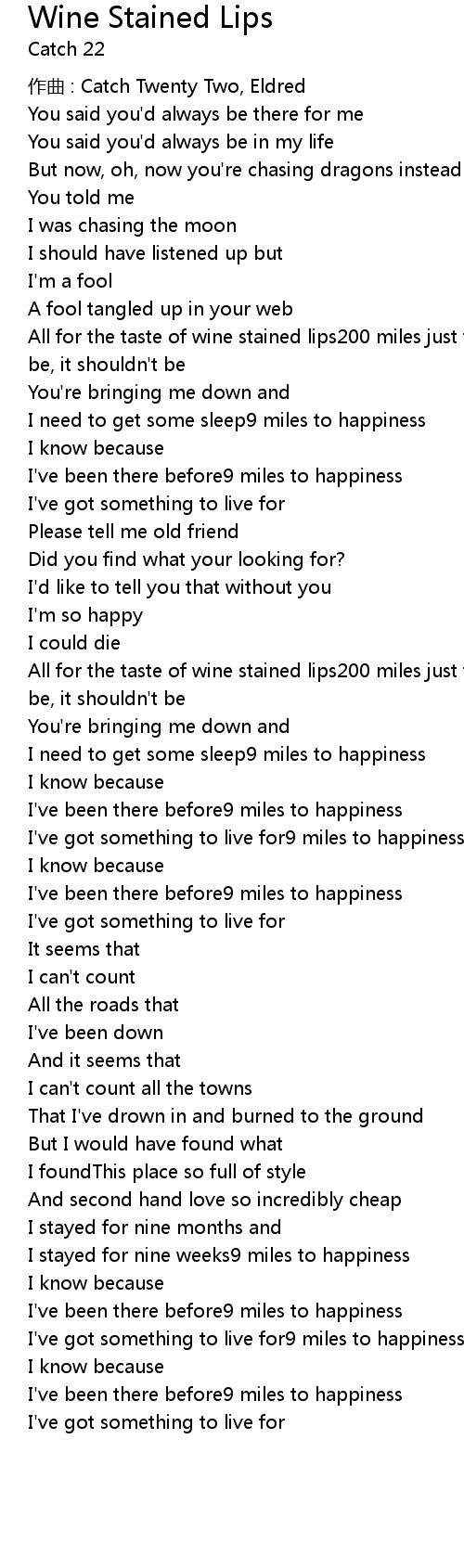 | All for the taste of wine stained lips200 miles just to get my fix it shouldn' t be, it shouldn' t be | |