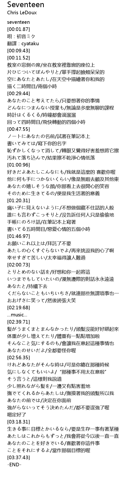 | [01:42.97] | 書いてる五時間目/戀愛心情的五個小時 |